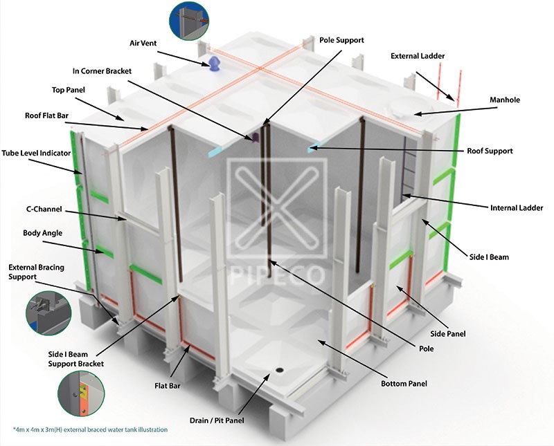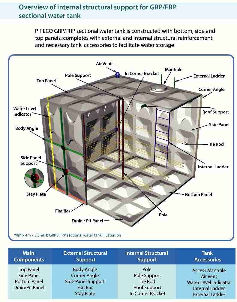 We can supply Rectangular/Sectional Panel Tanks that are either GRP (Glass Reinforced Plastic), HDG (Hot Dipped Galvanized) Steel or Stainless Steel panels. These tanks are appropriate for space constrained installations where cylindrical tanks may not be appropriate. Best for Drinking and Industrial Water usage. Also for storing certain mild industrial liquids and wastewater.